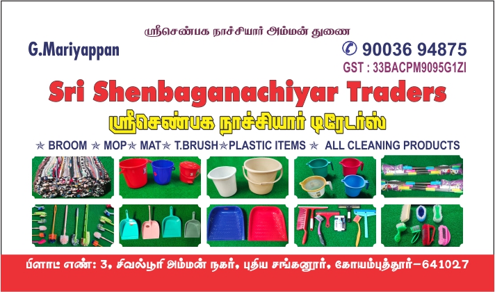 Sri Shenbaganachiyar Traders Cleaning Products Manufacturing, company located in Coimbatore, We service Provider of all kinds of Broom, MOP, MAT, T.BRUSH, PLASTIC ITEMS Whole sale supply and retail supply.